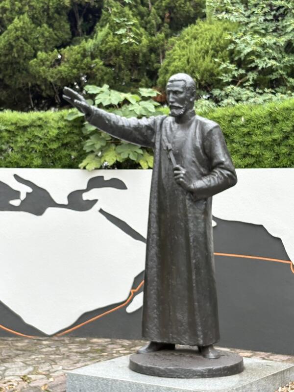 左手に十字架を持ち、右手を掲げたザビエルの像で、彫刻家佐藤忠良氏による1969年(昭和44年)の作品です。