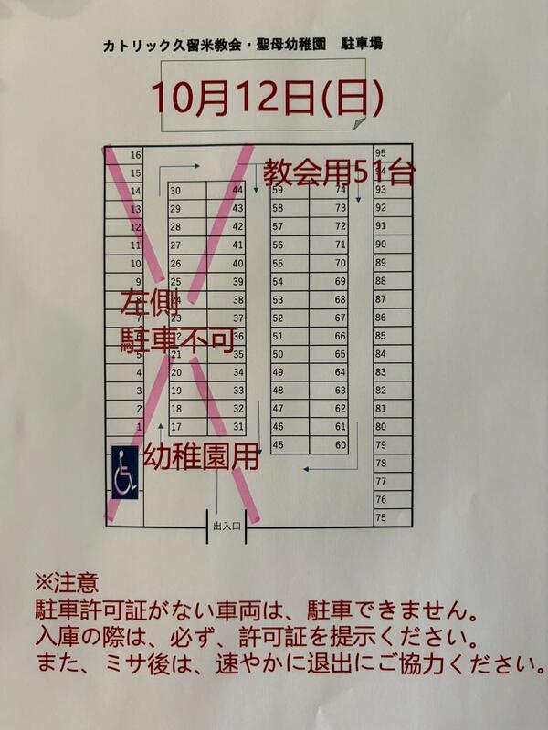 また、8:00ミサ時、大駐車場への駐車は、51台(右側半分)のみとなっています。